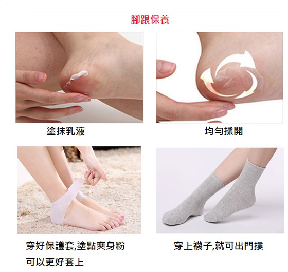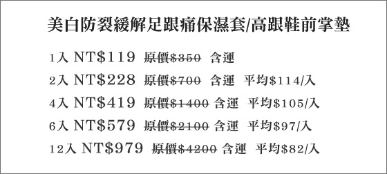 長期的穿脫或是習慣穿涼拖鞋、高跟鞋的愛美女性,終於有救了!不必花大錢做足部SPA,不必害怕長期使用具侵蝕效果的足膜,美白防裂緩解足跟痛保濕套與高跟鞋前掌墊,讓你再現水潤肌膚,向龜裂說掰掰!